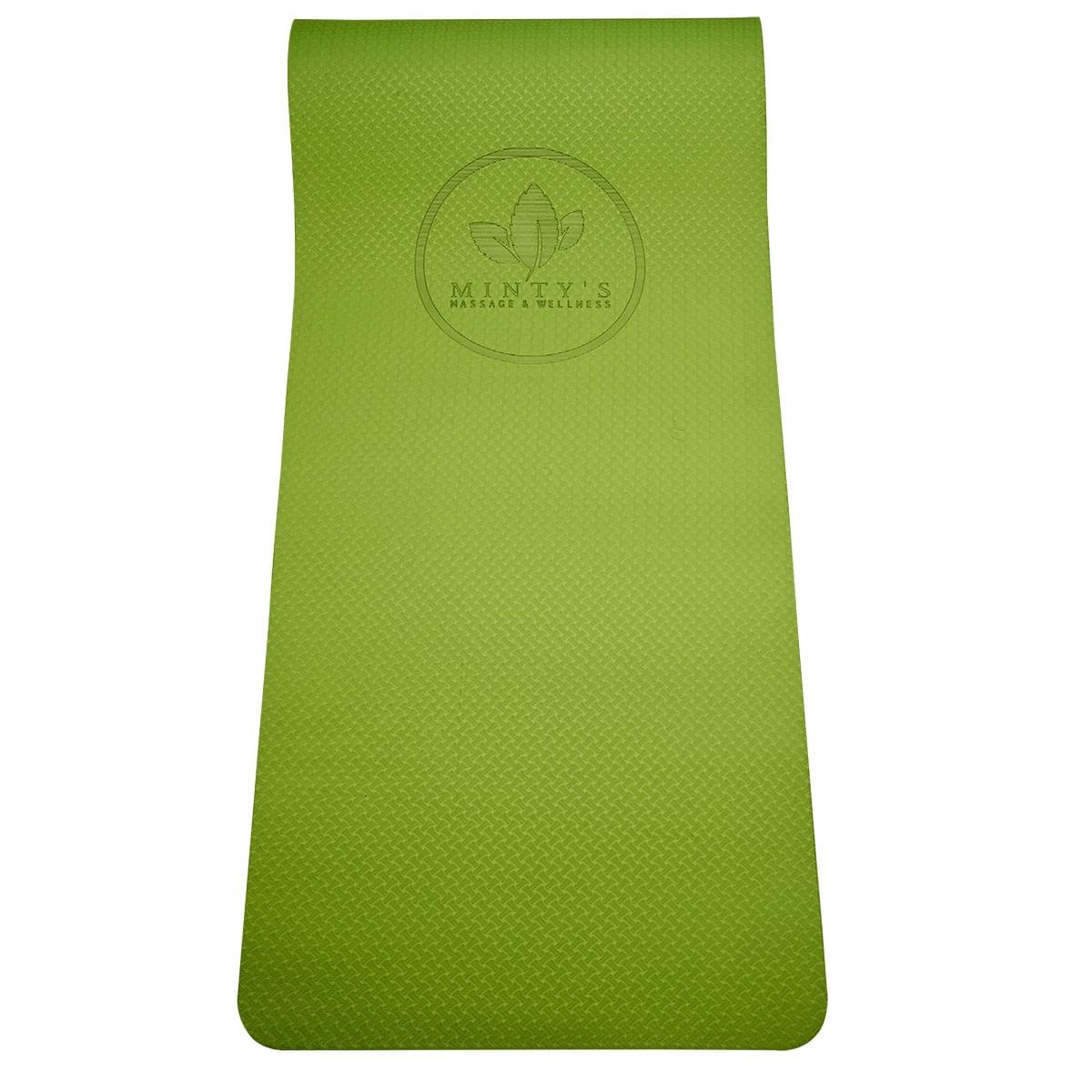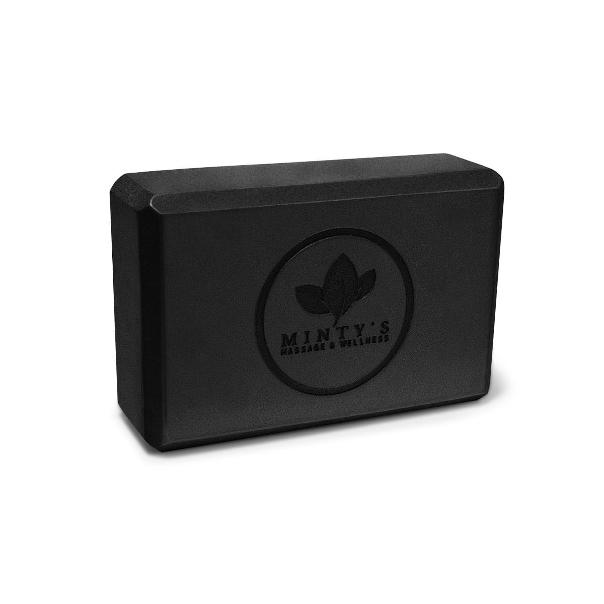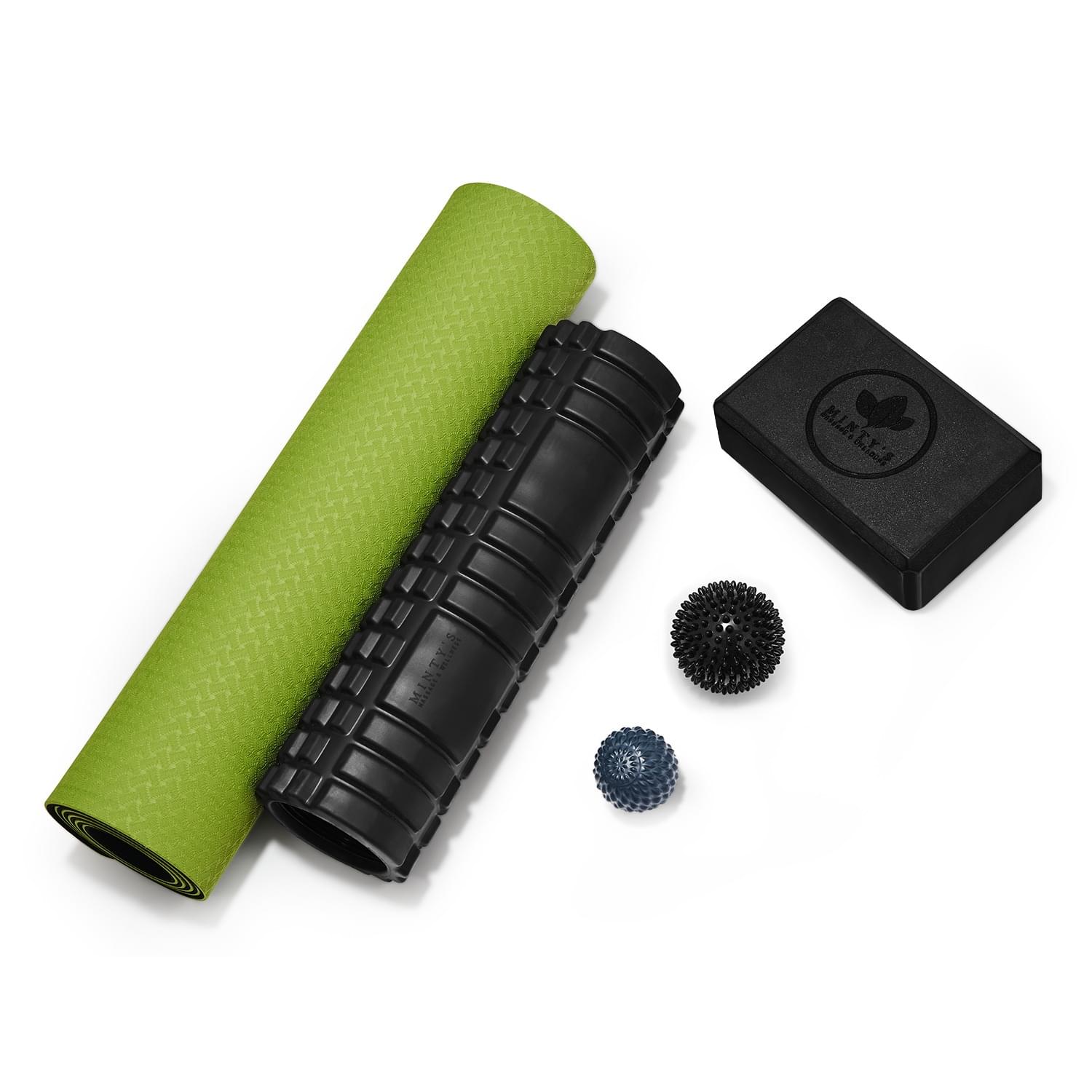 Minty's custom foam roller, yoga mat, yoga block, and two specialized massage balls.